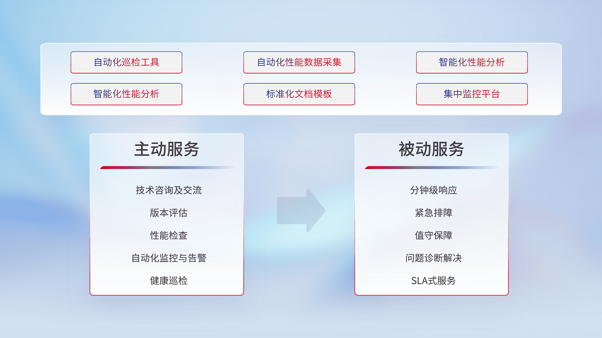 智能化工具和标准化文档,,,保障服务质量,,,,提供主动服务(包含技术咨询、、版本评估、、、、性能检查、、自动化监控与告警、、健康巡检)和被动服务包含(分钟级响应、、、、紧急排障、、、、值守保障、、、问题诊断解决、、SLA服务)。。。